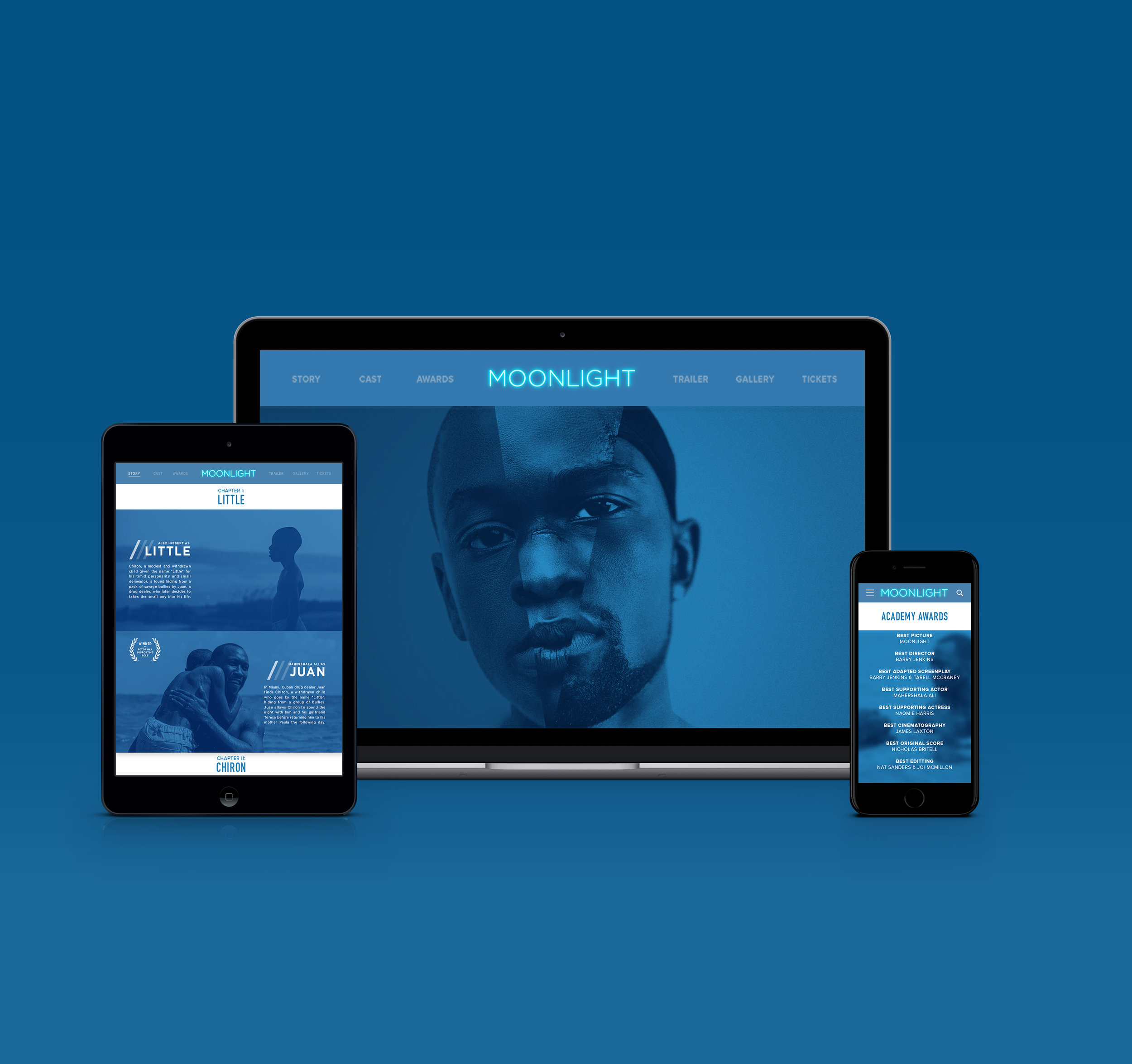 Moonlight is a transcendent film that is both agonizing yet heartwarming, and ultimately a true display of the humanity in us all. To engage in the praise surrounding the applauded film, the designer was tasked with creating a mobile-first site that drew attention to the film’s success as well as the emotional impact Moonlight has had on its audiences. The site features a tri-tone color palette meant to convey the protagonist, Chiron’s, three stages of identity through the course of the film.